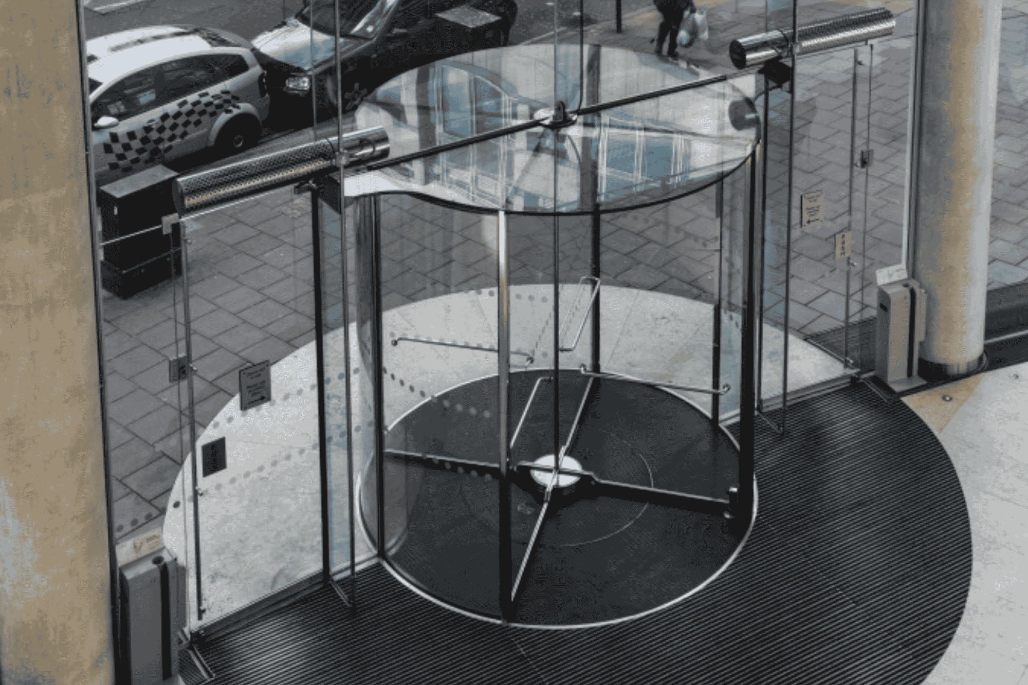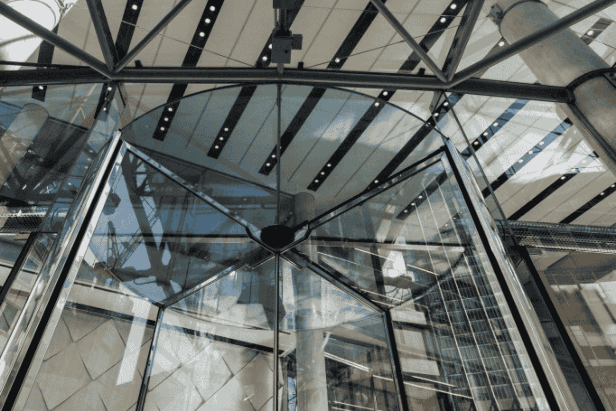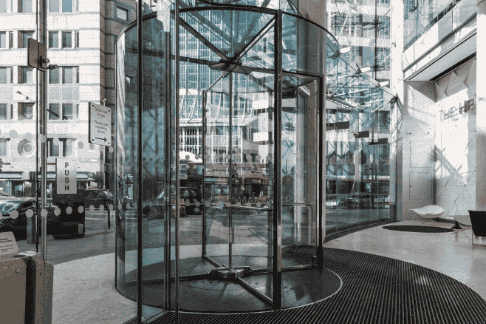 Die Drehtür bei The Helicon wurde als integraler Bestandteil der Fassade konzipiert und nicht als eigenständiges Element. Das Glasdach und die vertikale Glasfinne tragen strukturell zur Konstruktion bei und gewährleisten die Kontinuität zwischen Eingangsbereich und Gebäudehülle.